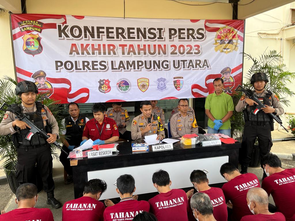 “Alhamdullilah, secara keseluruhan untuk gangguan kamtibmas yang terjadi di wilayah hukum polres lampung utara dan jajaran tahun 2023 mengalami penurunan 2 % dan penyelesaian kasus naik menjadi 26% dari tahun 2022,” ujar Kapolres Lampung Utara AKBP Teddy Rachesna, S.H., S.I.K., M.Si. saat menggelar Konferensi Pers, Sabtu (30/12/23).