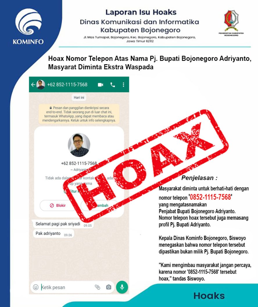 Hoax Nomor Telepon Mengatasnamakan Pj. Bupati Bojonegoro Adriyanto, Masyarakat Diminta Ekstra Waspada, Bojonegorokab.go.id – Masyarakat diminta untuk berhati-hati dengan nomor telepon ‘0852-1115-7568’ yang mengatasnamakan Penjabat (Pj) Bupati Bojonegoro Adriyanto. Nomor telepon hoax tersebut juga memasang profil Pj Bupati Adriyanto.