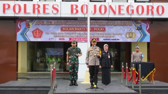 Polres Bojonegoro melaksanakan Apel Gelar Pasukan Gabungan TNI-Polri dan Pemerintah Daerah dalam Rangka Bulan Bakti TNI-Polri Tahun 2024 di halaman Mapolres Bojonegoro, Selasa(6/2/2024).